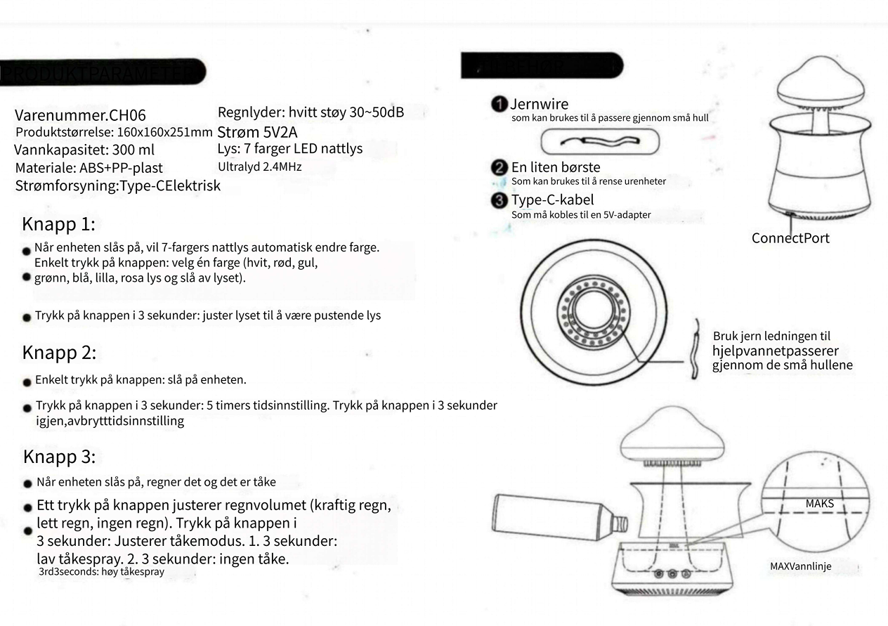 Kapasitet: Vanntank på under 1 liter, med en maks. luftfuktingskapasitet på 300 ml/t.